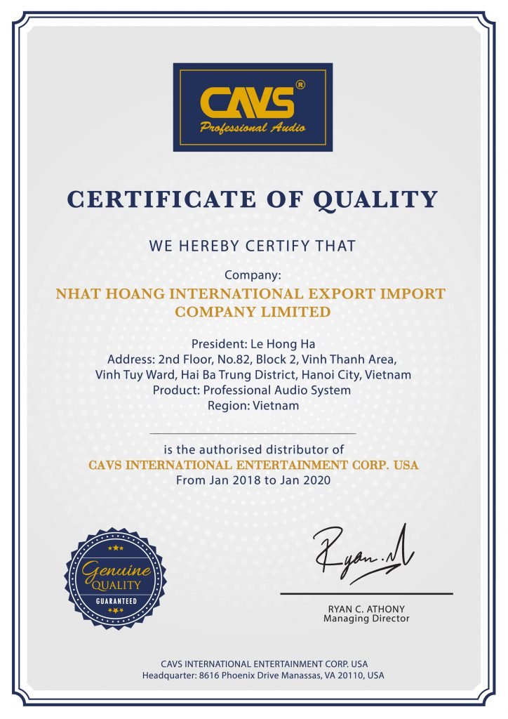 Sản phẩm được chuyển giao và sản xuất dựa trên các tiêu chuẩn Hãng CAVS tại USA, được các kỹ sư tại Mỹ giảm sát chất lượng từng bước để cho ra những sản phẩm đạt chất lượng tốt nhất. Thương hiệu CAVS là một trong những công ty hoạt động và phát triển lâu đời trong lĩnh vực sản xuất thiết bị điện tử âm thanh với nhiều năm kinh nghiệm và hoạt động sản xuất đã cho ra thị trường trên toàn thế giới nhiều sản phẩm.