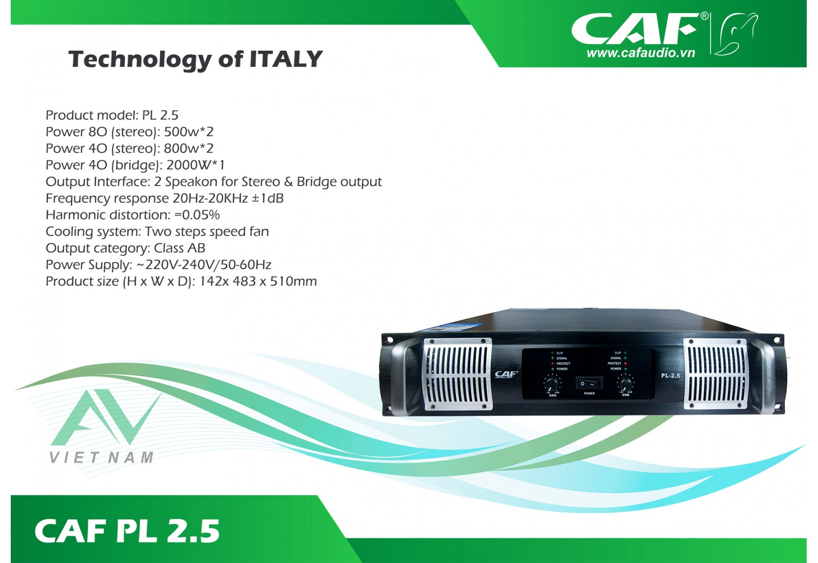 - Công suất 2 kênh x 500w/kênh thiết kế chuyên dụng cho Karaoke gia đình, hướng tới âm thanh chất lượng cao, sự ổn định bền bỉ... CAF PL 2.5 là cục đẩy công suất được nhiều gia đình, các căn hộ tin tưởng và sử dụng.