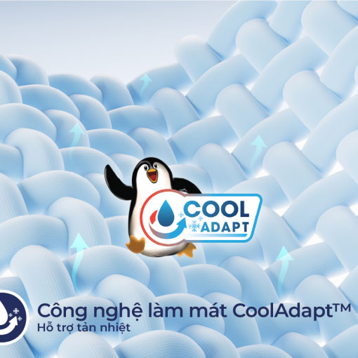 Công nghệ làm mát CoolAdapt™ được ứng dụng vào cấu trúc của từng sợi vải tạo nên lớp áo nệm luôn thoáng mát. Khi chúng ta ngủ, cơ thể duy trì nhiệt độ 37°C và tiếp tục tỏa nhiệt tạo mồ hôi; lúc này, công nghệ CoolAdapt™ hỗ trợ tản nhiệt bằng cách thúc đẩy sự bay hơi của các hạt mồ hôi tích tụ trên bề mặt vải, giúp không khí lưu thông tốt hơn từ đó tạo nên môi trường nghỉ ngơi thoáng mát.