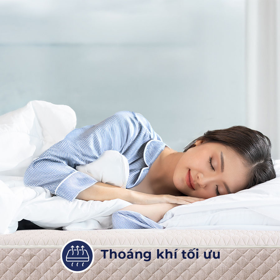 Chất liệu cao su thiên nhiên với cấu trúc bọt hở giúp không khí lưu thông tốt và ngăn ngừa tích tụ hơi nóng. Nhờ đó, bạn không cảm thấy hầm bí khi nằm ngủ trên nệm, phù hợp với khí hậu nóng ẩm tại Việt Nam.