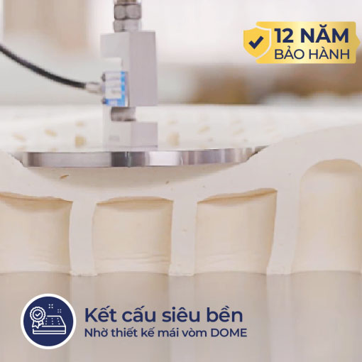 Thiết kế mái vòm mang đến kết cấu siêu bền, hạn chế xẹp lún và không thay đổi hình dạng ngay cả khi không xoay đảo chiều nệm suốt quá trình sử dụng. Điều này đã được kiểm chứng thông qua một loạt bài kiểm tra chất lượng nghiêm ngặt, bao gồm bài kiểm tra đặc biệt với trục lăn nặng 145kg. Kết quả cho thấy, nệm L'ADOME Cool chịu được hơn 120.000 lần, gấp đôi số lượng vòng lăn trên nệm cao su có cấu trúc ô vuông truyền thống.